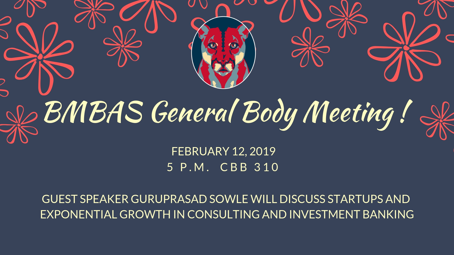 Join us for the first General Body Meeting of the spring 2019 semester.  Guest speaker Guruprasad Sowle, a C-level strategy, finance, and technology expert, will be speaking about startups and exponential growth in consulting and investment banking.  Don’t miss it!
